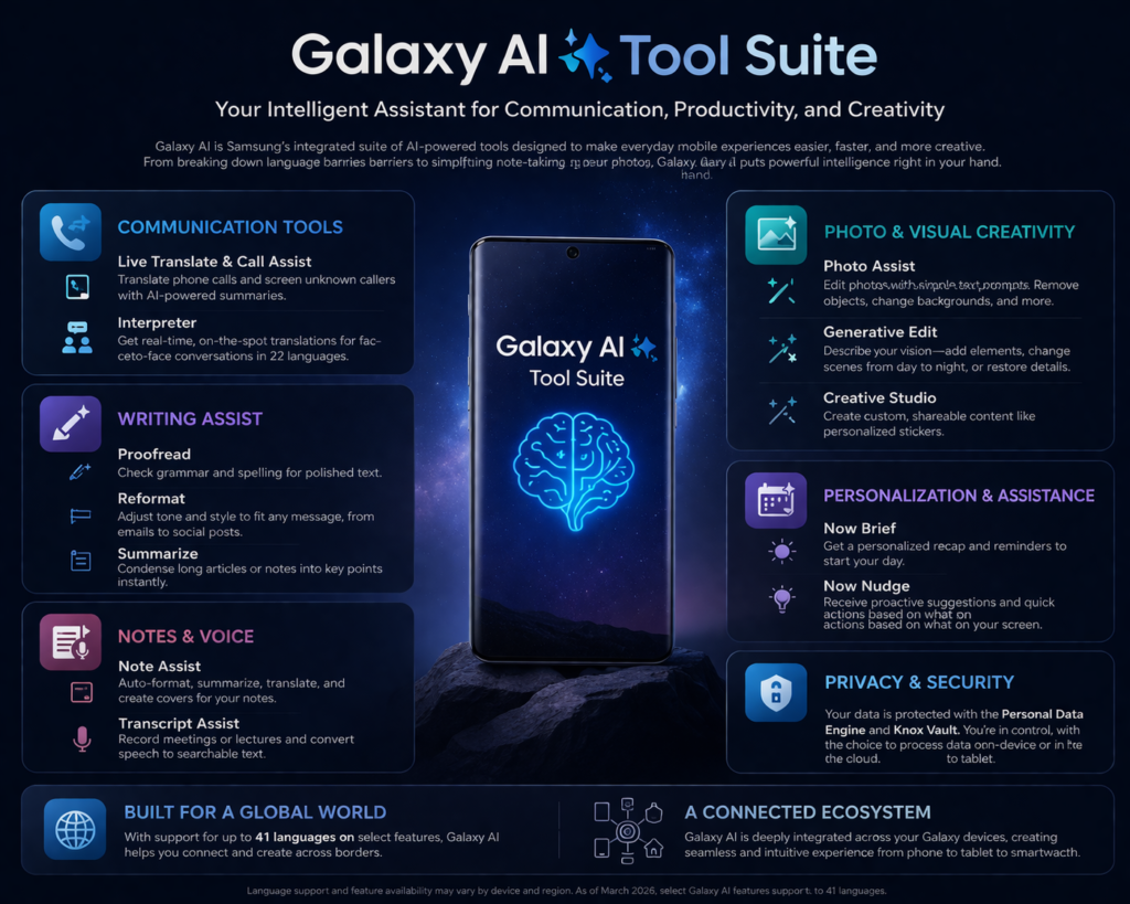 The Galaxy AI Tool Suite refers to Samsung’s family of AI-powered features available on supported Galaxy devices. These tools are not limited to one narrow use case. Instead, they span several categories: communication, writing, note-taking, voice transcription, search, image editing, personalization, and device assistance. Samsung’s official Galaxy AI pages consistently group these tools around real-world activities rather than abstract AI language, which suggests the company wants users to think of them as practical helpers rather than experimental add-ons.